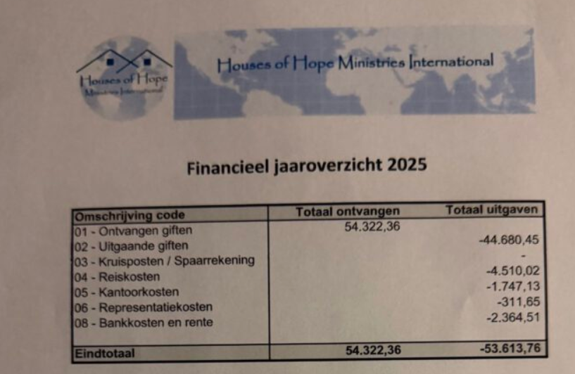 Houses of Hope Ministries International heeft als beleid géén beloningen uit te keren.